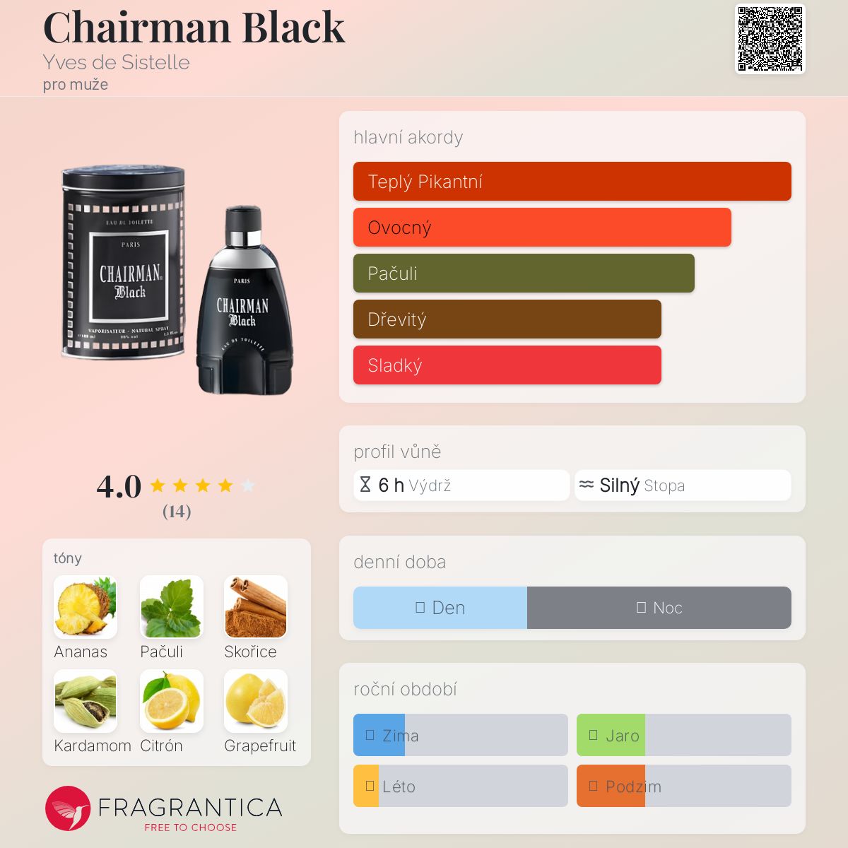 Chairman Black podle Yves de Sistelle je Orientální Woody vůně pro muže. Vrchní tóny jsou Citrón a Grapefruit; střední tóny jsouAnanas, Skořice, Kardamom a Zelené jablko ; základní tóny jsou Pačuli, Jantar (ambra) a Cedr.