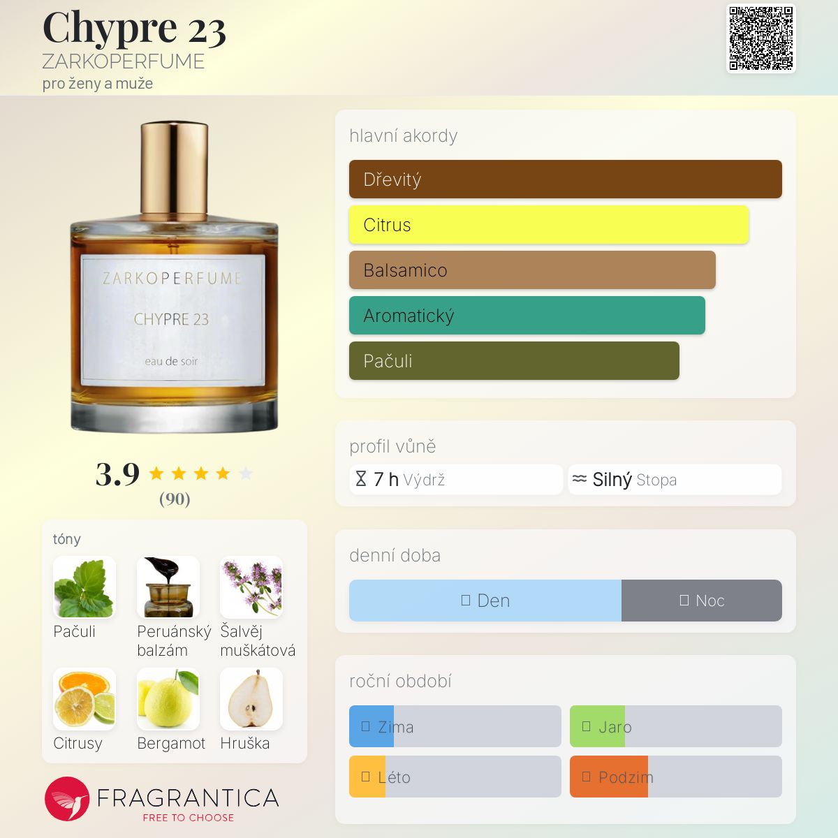 Chypre 23 podle ZARKOPERFUME je Chypre vůně pro ženy a muže. Chypre 23 byl/a uveden/a v roce 2017. "Nosem" za touto vůní je Zarko Ahlmann Pavlov. Vrchní tóny jsou Citrusy, Bergamot, Hruška a Pomeranč; střední tóny jsouŠalvěj muškátová a Růže ; základní tóny jsou Pačuli, Peruánský balzám, Vetiver, Santalové dřevo a Pižmo.