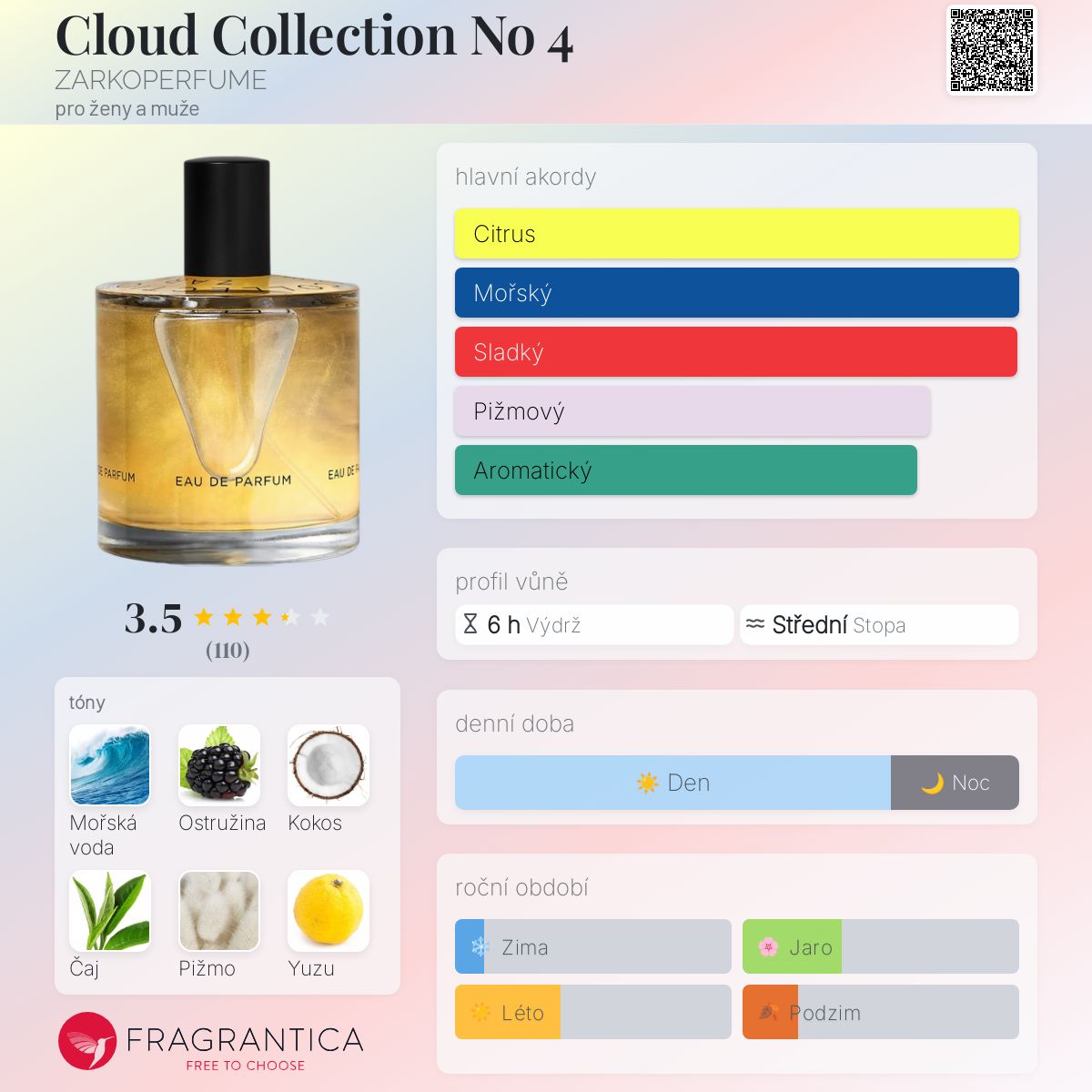 Cloud Collection No 4 podle ZARKOPERFUME je Floral Woody Musk vůně pro ženy a muže. Cloud Collection No 4 byl/a uveden/a v roce 2023. "Nosem" za touto vůní je Zarko Ahlmann Pavlov. Vrchní tóny jsou Ostružina, Yuzu, Citrón, Růžový pepř a Pepř; střední tóny jsouMořská voda, Kokos, Černý čaj, Bílá orchidej, Pomeranč, Květiny a Jasmín ; základní tóny jsou Pižmo, Vanilka, Dreamwood, Kašmír a Cedr.
