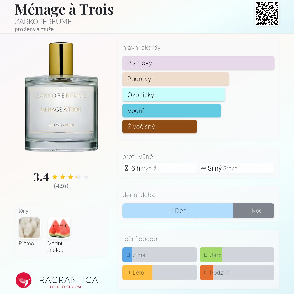 Ménage à Trois podle ZARKOPERFUME je Aromatic vůně pro ženy a muže. Ménage à Trois byl/a uveden/a v roce 2016. "Nosem" za touto vůní je Zarko Ahlmann Pavlov.