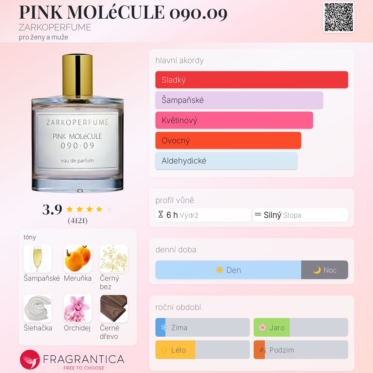 PINK MOLéCULE 090.09 podle ZARKOPERFUME je Floral Fruity Gourmand vůně pro ženy a muže. PINK MOLéCULE 090.09 byl/a uveden/a v roce 2014. Vrchní tóny jsou Šampaňské, Meruňka, Černý bez a Černá orchidej; základní tóny jsou Šlehačka, Černé dřevo a Mahagon.