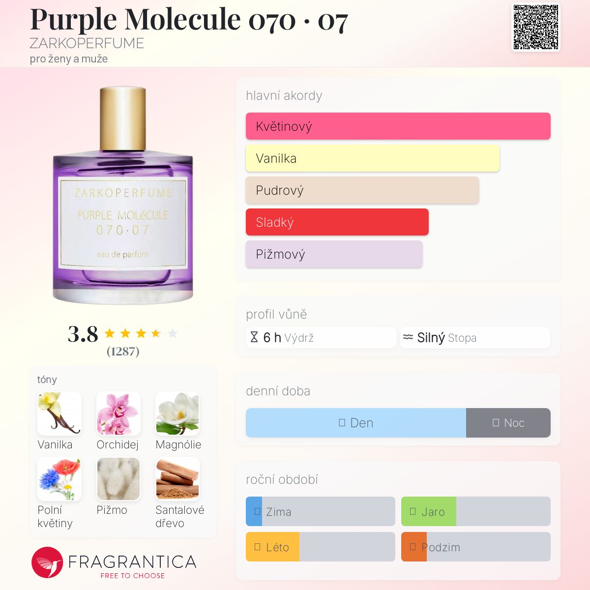 Purple Molecule 070 · 07 podle ZARKOPERFUME je Orientální Vanilla vůně pro ženy a muže. Purple Molecule 070 · 07 byl/a uveden/a v roce 2019. "Nosem" za touto vůní je Zarko Ahlmann Pavlov. Vrchní tóny jsou Bílá orchidej, Magnólie a Polní květiny; základní tóny jsou Madagaskarská vanilka, Pižmo a Santalové dřevo.