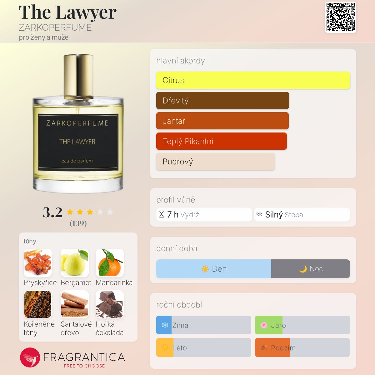 The Lawyer podle ZARKOPERFUME je Citrus Gourmand vůně pro ženy a muže. The Lawyer byl/a uveden/a v roce 2020. "Nosem" za touto vůní je Zarko Ahlmann Pavlov. Vrchní tóny jsou Bergamot, Mandarinka a Citrón; střední tóny jsouKoření, Hořká čokoláda a Bílá orchidej ; základní tóny jsou Pryskyřice, Santalové dřevo a Pižmo.