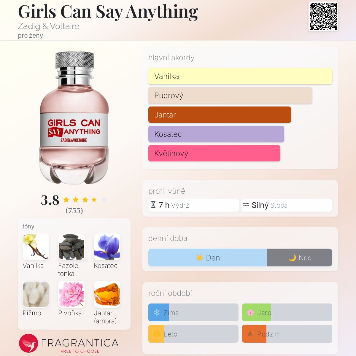 Girls Can Say Anything podle Zadig & Voltaire je Orientální Fougere vůně pro ženy. Girls Can Say Anything byl/a uveden/a v roce 2018. "Nosem" za touto vůní je Quentin Bisch. Vrchní tóny jsou Kosatec a Pivoňka; střední tón jeFazole tonka ; základní tóny jsou Vanilka, Pižmo, Jantar (ambra) a Kapradina.