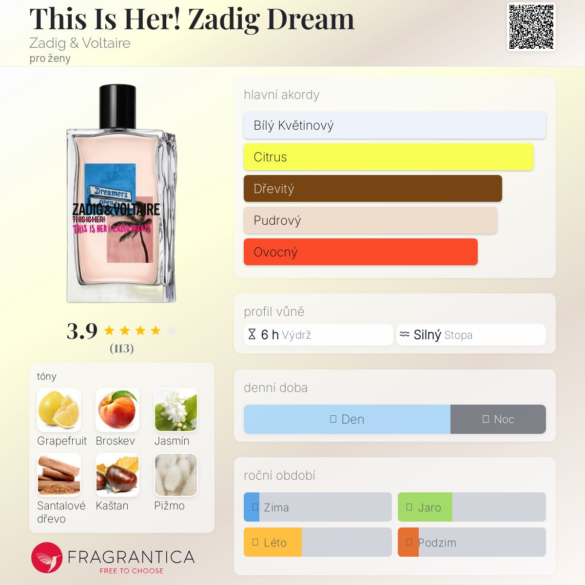 This Is Her! Zadig Dream podle Zadig & Voltaire je vůně pro ženy. This Is Her! Zadig Dream byl/a uveden/a v roce 2023. Vrchní tóny jsou Grapefruit, Broskev a Lískový oříšek; střední tóny jsouJasmín, Kaštan a Konvalinka ; základní tóny jsou Santalové dřevo, Pižmo a Benzoin.