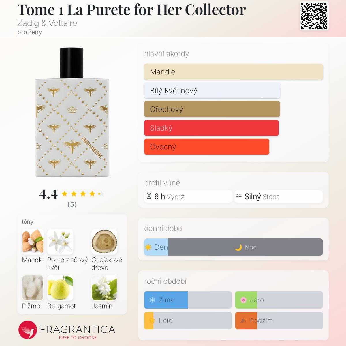 Tome 1 La Purete for Her Collector podle Zadig & Voltaire je Floral Woody Musk vůně pro ženy. Tome 1 La Purete for Her Collector byl/a uveden/a v roce 2012. "Nosem" za touto vůní je Nathalie Lorson. Vrchní tóny jsou Pomerančový květ, Bergamot a Pivoňka; střední tóny jsouMandlové mléko, Jasmín a Fazole tonka ; základní tóny jsou Guajakové dřevo a Bílé pižmo.