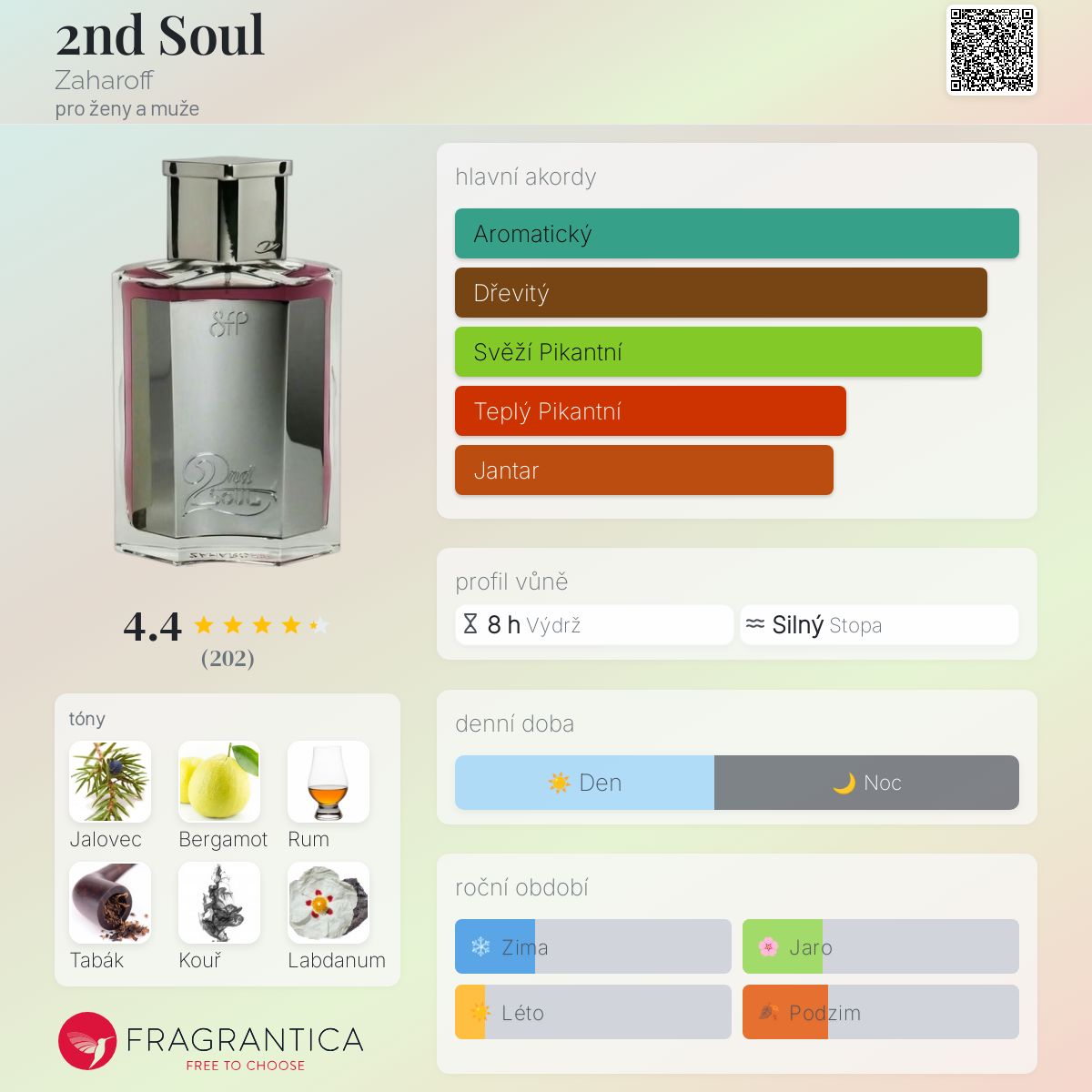 2nd Soul podle Zaharoff je Orientální Floral vůně pro ženy a muže. 2nd Soul byl/a uveden/a v roce 2022. "Nosem" za touto vůní je Vincent Kuczinski. Vrchní tóny jsou Jalovec, Bergamot, Rum, Muškátový oříšek a Kardamom; střední tóny jsouTabák, Pelargónie, Konvalinka, Myrha, Jasmín a Šalvěj muškátová ; základní tóny jsou Kouř, Labdanum, Pačuli, Semiš, Cedr, Vetiver a Mech.