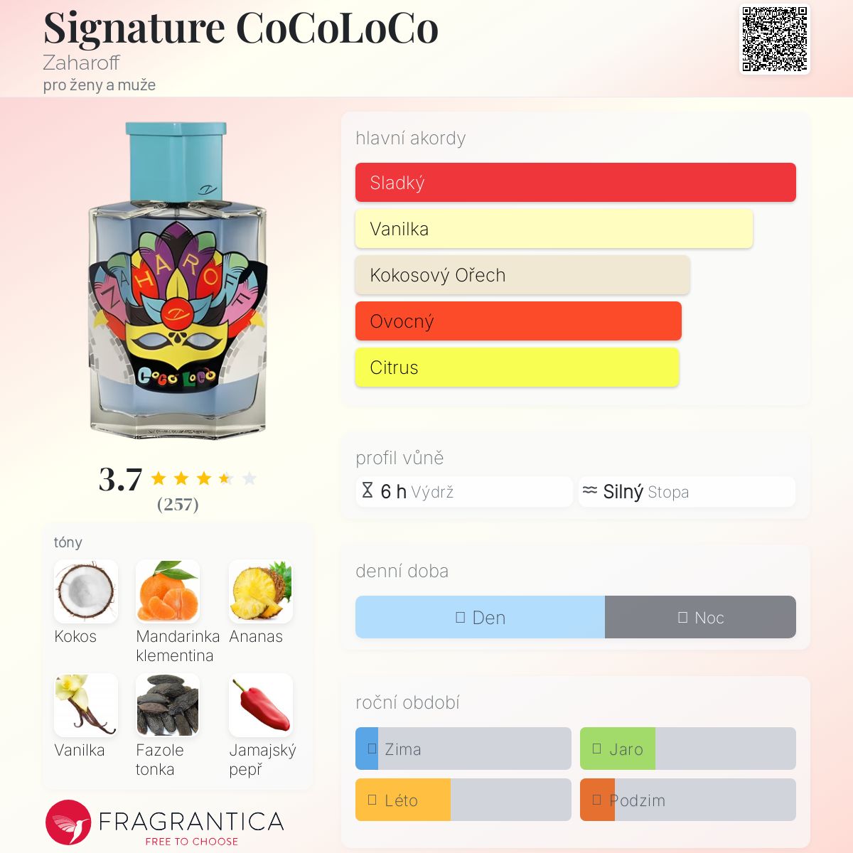 Signature CoCoLoCo podle Zaharoff je vůně pro ženy a muže. Signature CoCoLoCo byl/a uveden/a v roce 2023. Vrchní tóny jsou Mandarinka klementina, Ananas, Hruška a Kardamom; střední tóny jsouKokos, Jamajský pepř, Jasmín mnohokvětý, Cedr a Neroli ; základní tóny jsou Vanilka, Fazole tonka, Bílé pižmo, Otočník a Benzoin.