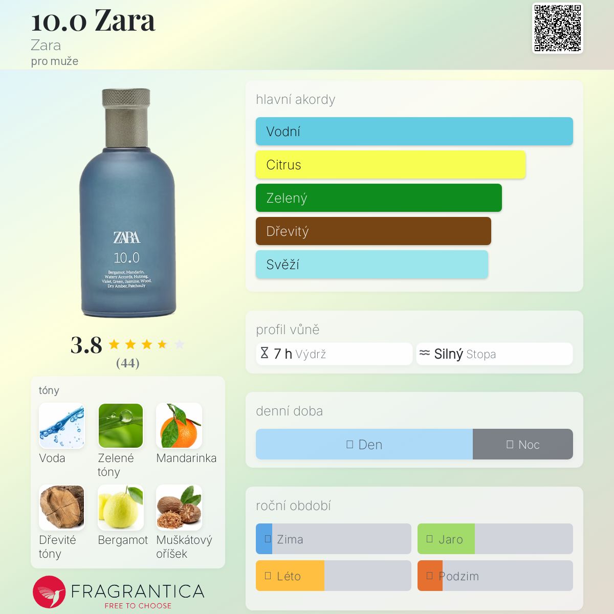 10.0 Zara podle Zara je Aromatic Aquatic vůně pro muže. 10.0 Zara byl/a uveden/a v roce 2019. Vrchní tóny jsou Vodnaté tóny, Mandarinka, Bergamot a Muškátový oříšek; střední tóny jsouZelené tóny, Fialka a Jasmín ; základní tóny jsou Dřevité tóny, Jantar (ambra) a Pačuli.