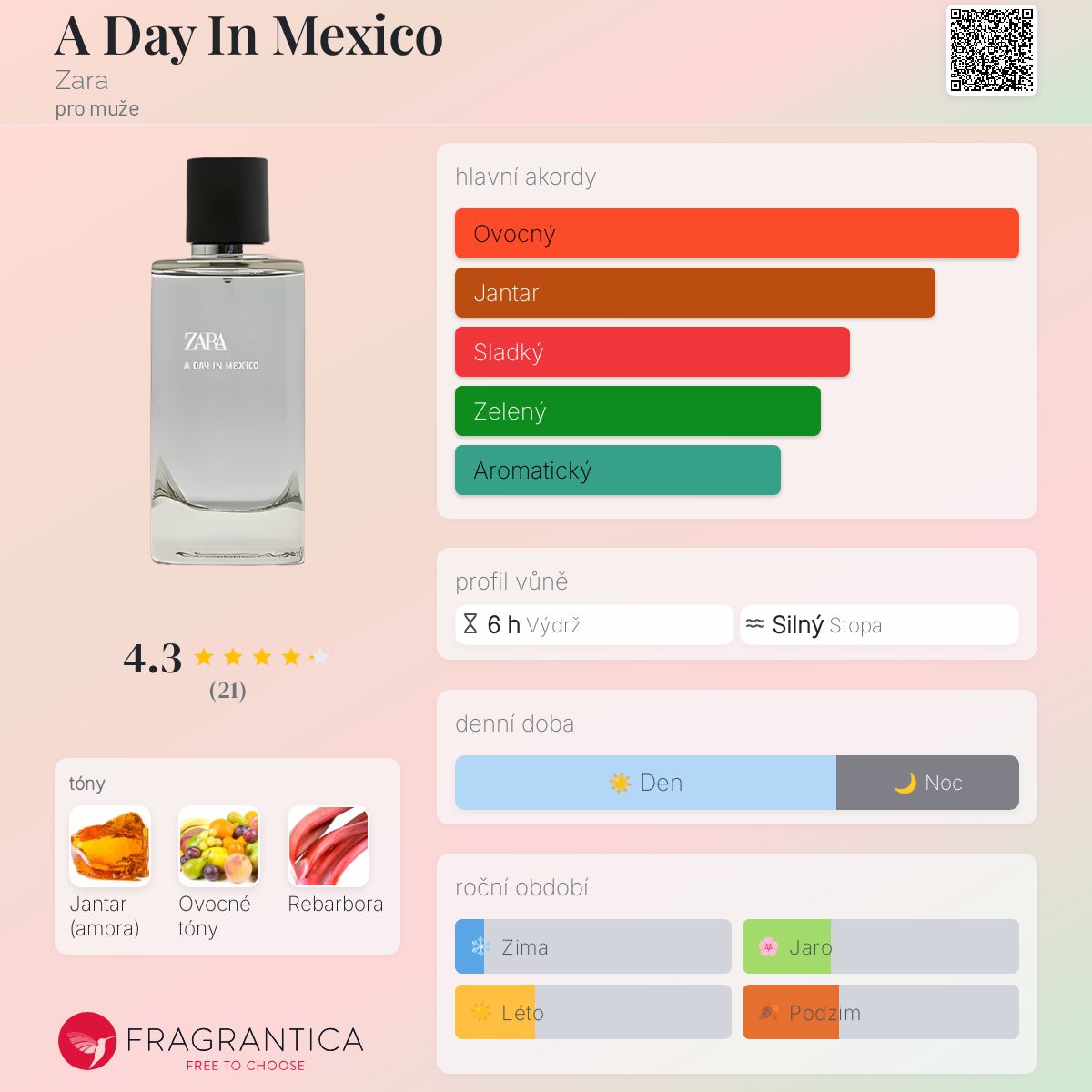 A Day In Mexico podle Zara je Orientální Fougere vůně pro muže. A Day In Mexico byl/a uveden/a v roce 2019. Vrchní tón je Rebarbora ; střední tón jeOvoce ; základní tón je Jantar (ambra).