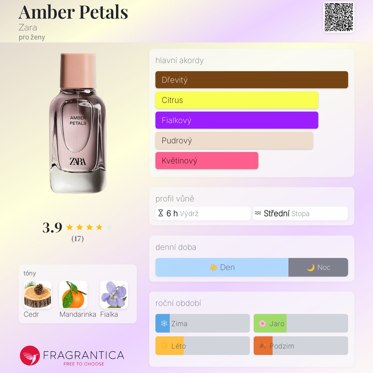 Amber Petals podle Zara je Floral vůně pro ženy. Amber Petals byl/a uveden/a v roce 2021. Vrchní tón je Mandarinka ; střední tón jeFialka ; základní tón je Cedr.