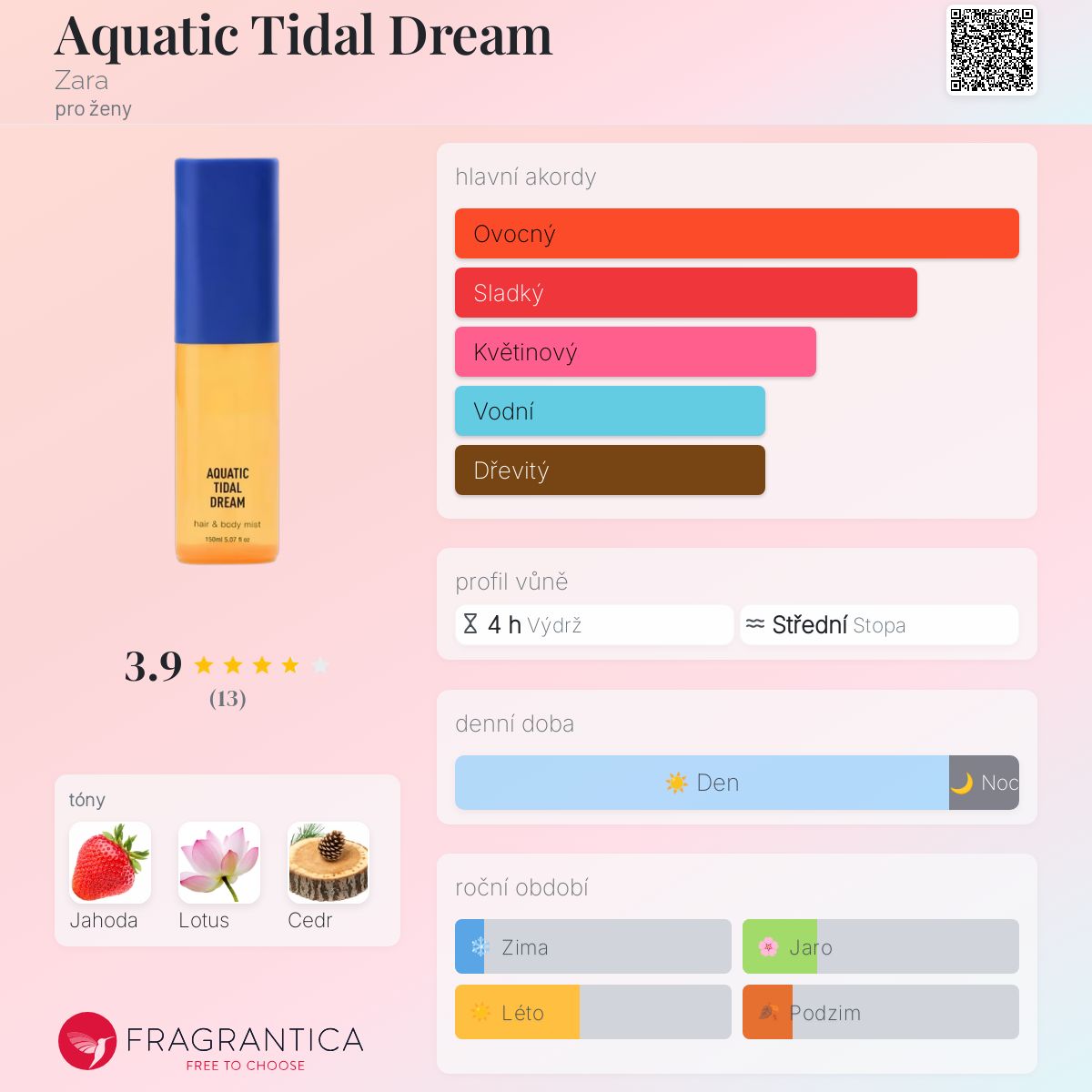 Aquatic Tidal Dream podle Zara je Floral Fruity vůně pro ženy. Toto je nová vůně. Aquatic Tidal Dream byl/a uveden/a v roce 2025. Vrchní tón je Jahoda ; střední tón jeLotus ; základní tón je Cedr.
