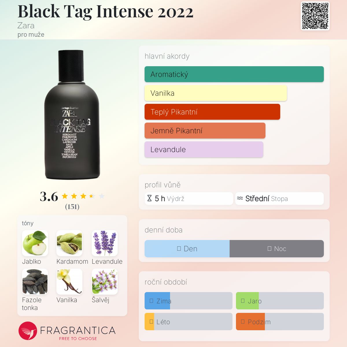Black Tag Intense 2022 podle Zara je Woody Spicy vůně pro muže. Black Tag Intense 2022 byl/a uveden/a v roce 2022. Vrchní tóny jsou Kardamom, Růžový pepř a Bergamot; střední tóny jsouJablko, Levandule, Vanilka a Šalvěj ; základní tóny jsou Fazole tonka, Vetiver a Pačuli.