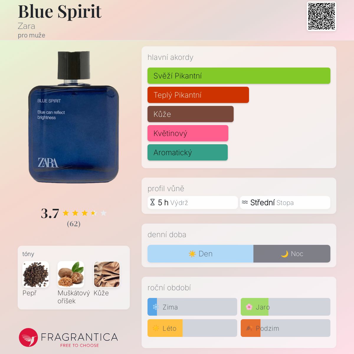Blue Spirit podle Zara je Orientální Spicy vůně pro muže. Blue Spirit byl/a uveden/a v roce 2019. Vrchní tón je Pepř ; střední tón jeMuškátový oříšek ; základní tón je Kůže.