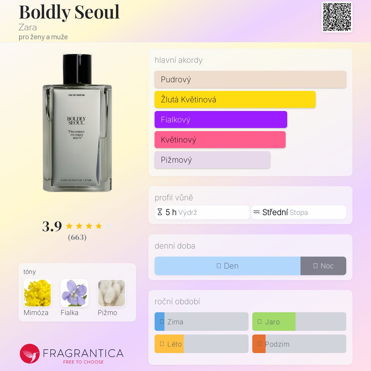 Boldly Seoul podle Zara je Floral vůně pro ženy a muže. Boldly Seoul byl/a uveden/a v roce 2021. "Nosem" za touto vůní je Jo Malone. Vrchní tón je Fialka ; střední tón jeMimóza ; základní tón je Pižmo.