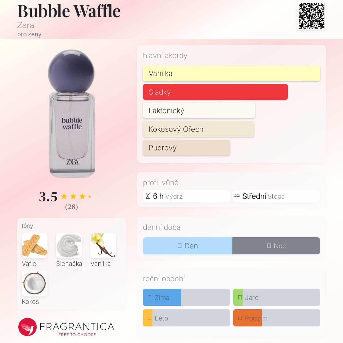 Bubble Waffle podle Zara je Orientální Vanilla vůně pro ženy. Toto je nová vůně. Bubble Waffle byl/a uveden/a v roce 2025. Vrchní tón je Kokos ; střední tóny jsouVafle a Šlehačka ; základní tón je Vanilka.