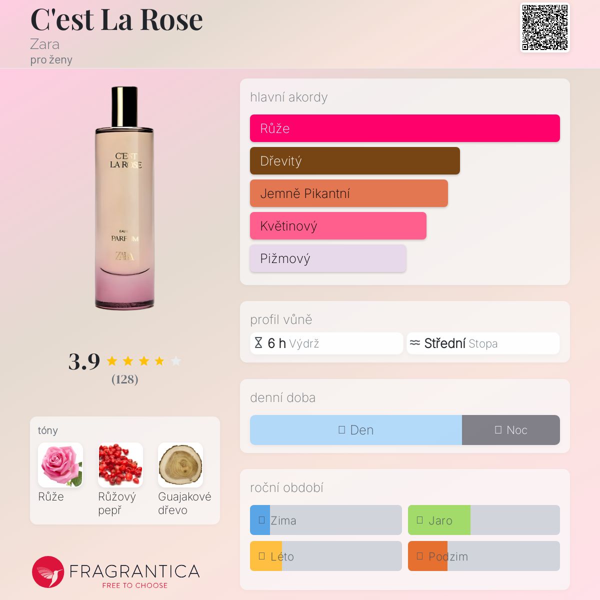 C'est La Rose podle Zara je vůně pro ženy. Toto je nová vůně. C'est La Rose byl/a uveden/a v roce 2024. Vrchní tón je Růžový pepř ; střední tón jeRůže ; základní tón je Guajakové dřevo.
