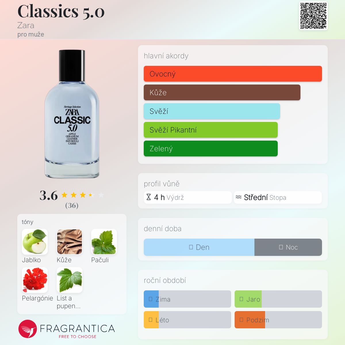 Classics 5.0 podle Zara je Orientální Woody vůně pro muže. Classics 5.0 byl/a uveden/a v roce 2020. Vrchní tóny jsou Jablko a Černý rybíz; střední tón jePelargónie ; základní tóny jsou Kůže a Pačuli.