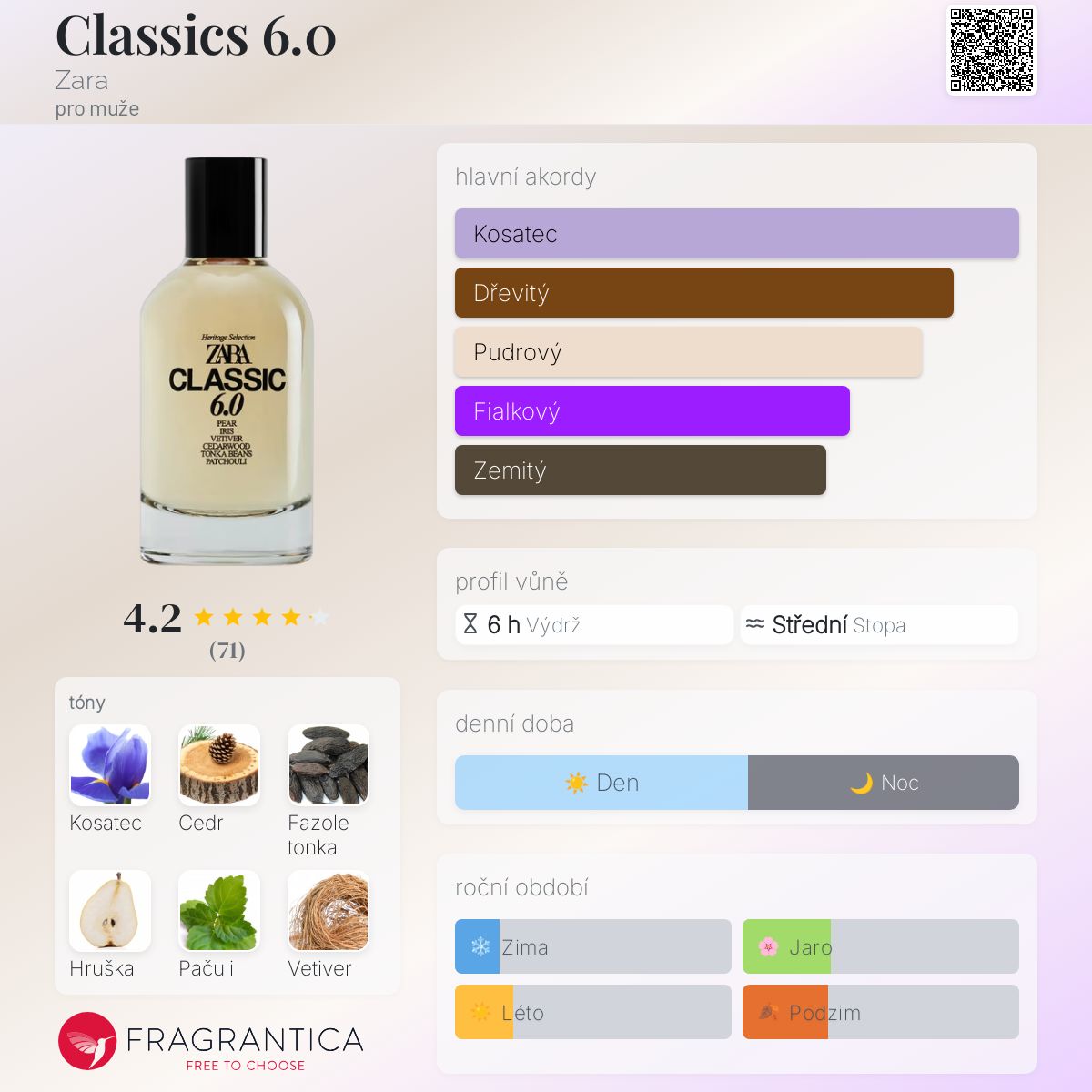 Classics 6.0 podle Zara je Orientální Floral vůně pro muže. Classics 6.0 byl/a uveden/a v roce 2020. Vrchní tóny jsou Kosatec a Hruška; střední tóny jsouCedr a Vetiver ; základní tóny jsou Fazole tonka a Pačuli.
