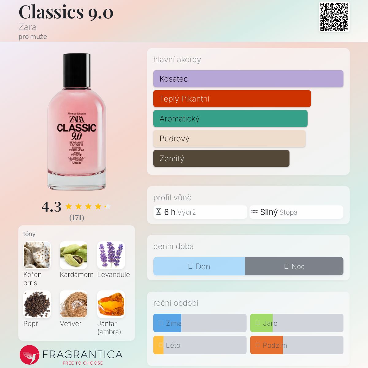 Classics 9.0 podle Zara je Orientální Woody vůně pro muže. Classics 9.0 byl/a uveden/a v roce 2020. "Nosem" za touto vůní je Amandine Galliano. Vrchní tóny jsou Levandule, Pepř a Bergamot; střední tóny jsouOrris, Kardamom a Vetiver ; základní tóny jsou Jantar (ambra), Cedr a Pačuli.