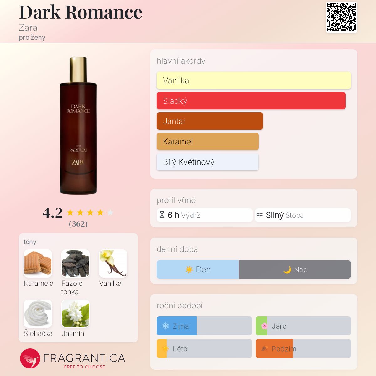 Dark Romance podle Zara je Orientální Vanilla vůně pro ženy. Toto je nová vůně. Dark Romance byl/a uveden/a v roce 2024. Vrchní tón je Jasmín ; střední tóny jsouFazole tonka a Šlehačka ; základní tóny jsou Karamela a Vanilka.