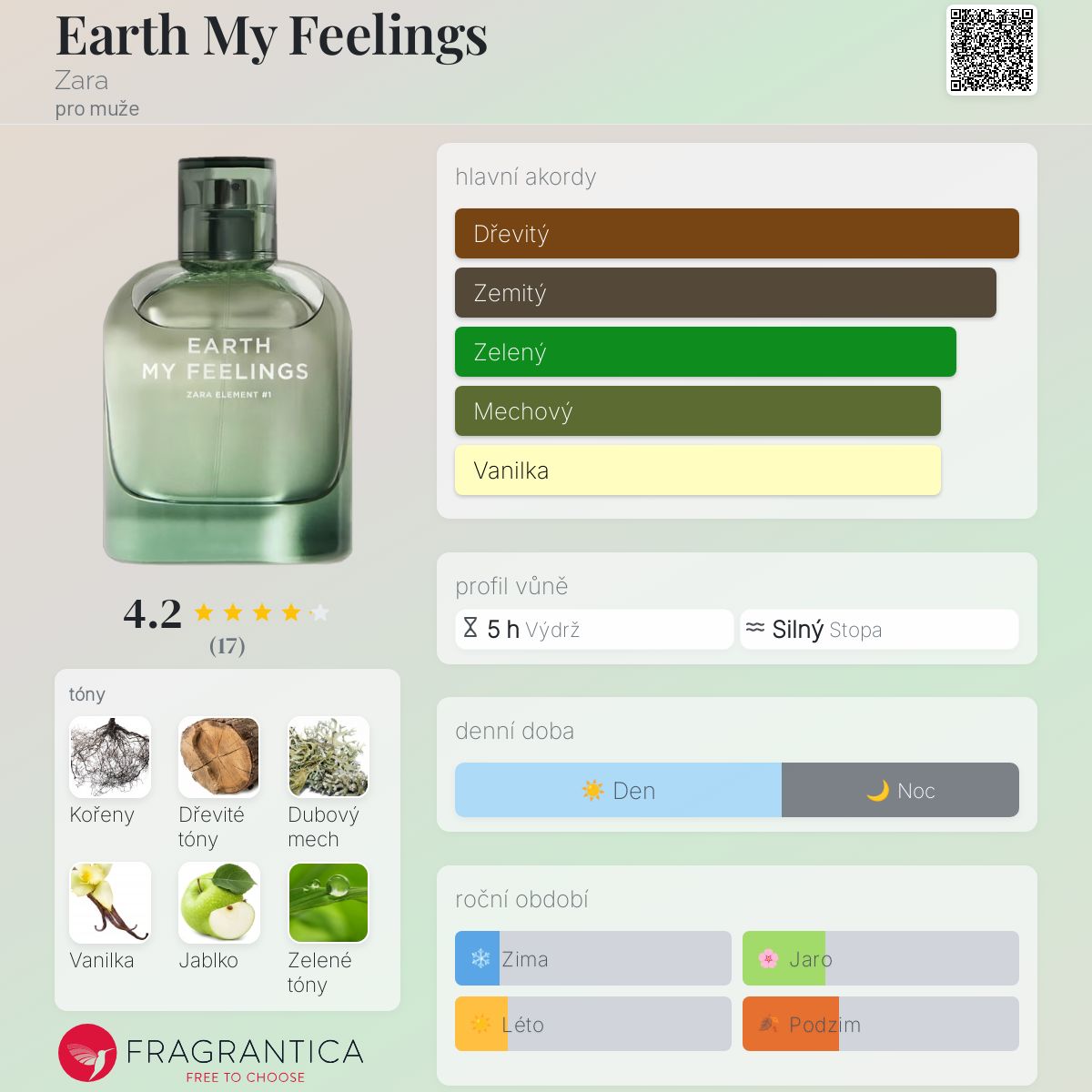 Earth My Feelings podle Zara je Woody Spicy vůně pro muže. Earth My Feelings byl/a uveden/a v roce 2022. Vrchní tón je Jablko ; střední tóny jsouKořeny, Dřevité tóny, Mech a Zelené tóny ; základní tóny jsou Vanilka a Jantar (ambra).