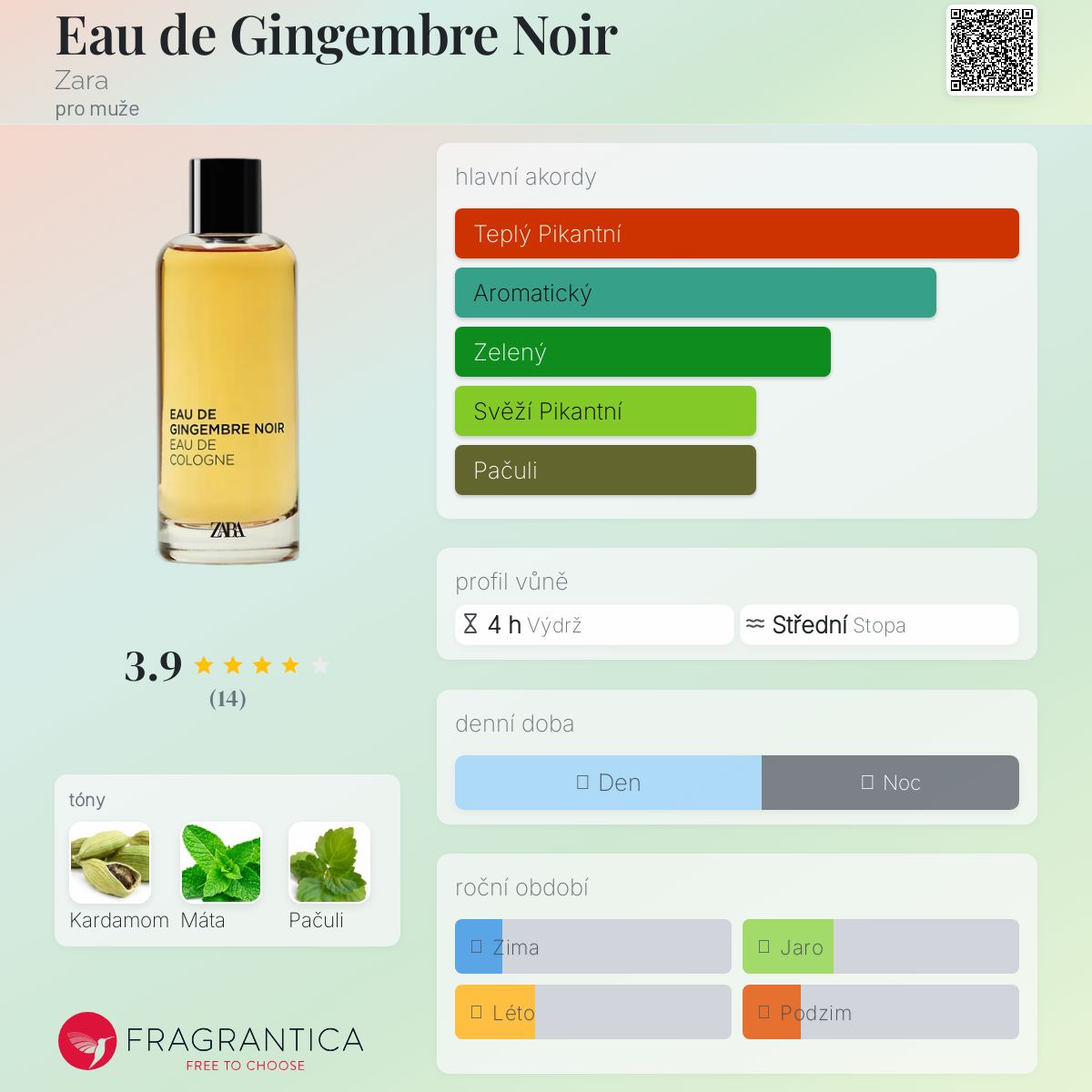 Eau de Gingembre Noir podle Zara je Woody Spicy vůně pro muže. Eau de Gingembre Noir byl/a uveden/a v roce 2021. Vrchní tón je Kardamom ; střední tón jeMáta ; základní tón je Pačuli.