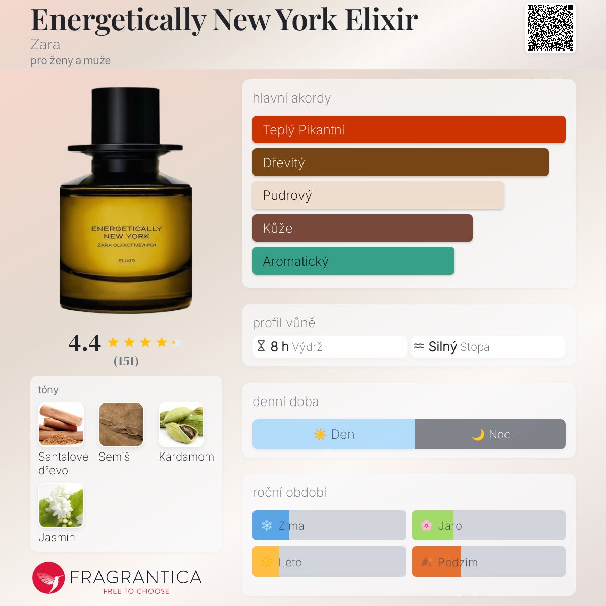 Energetically New York Elixir podle Zara je Orientální Floral vůně pro ženy a muže. Toto je nová vůně. Energetically New York Elixir byl/a uveden/a v roce 2025. "Nosem" za touto vůní je Jo Malone. Vrchní tón je Kardamom ; střední tón jeJasmín ; základní tóny jsou Santalové dřevo a Semiš.