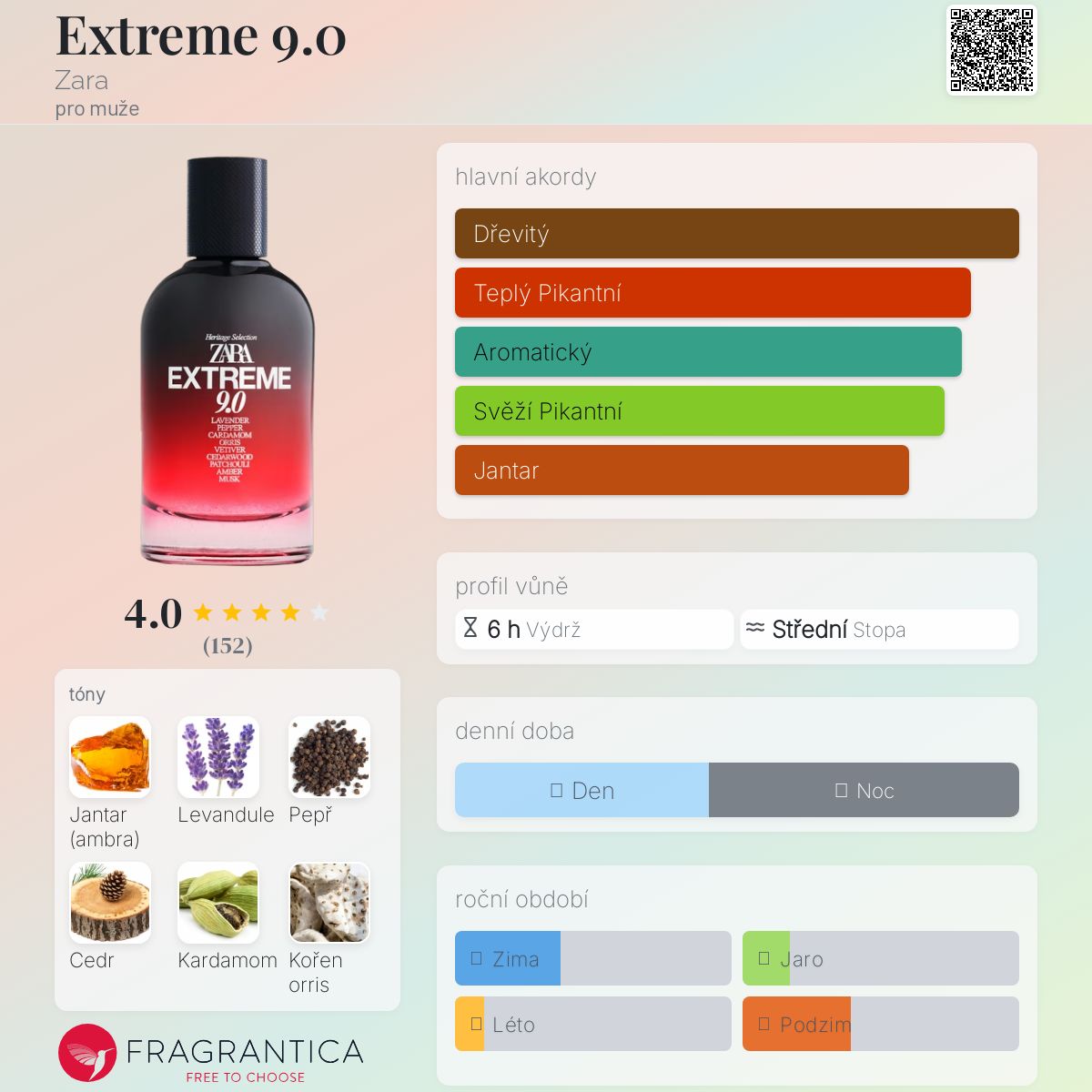 Extreme 9.0 podle Zara je Orientální Spicy vůně pro muže. Extreme 9.0 byl/a uveden/a v roce 2020. Vrchní tóny jsou Levandule, Pepř a Kardamom; střední tóny jsouCedr, Orris a Vetiver ; základní tóny jsou Jantar (ambra), Pačuli a Pižmo.