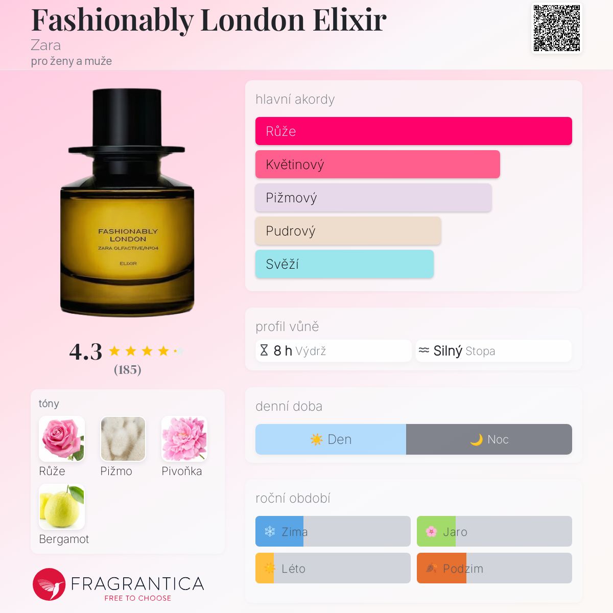 Fashionably London Elixir podle Zara je Floral vůně pro ženy a muže. Toto je nová vůně. Fashionably London Elixir byl/a uveden/a v roce 2025. "Nosem" za touto vůní je Jo Malone. Vrchní tón je Bergamot ; střední tóny jsouRůže a Pivoňka ; základní tón je Pižmo.