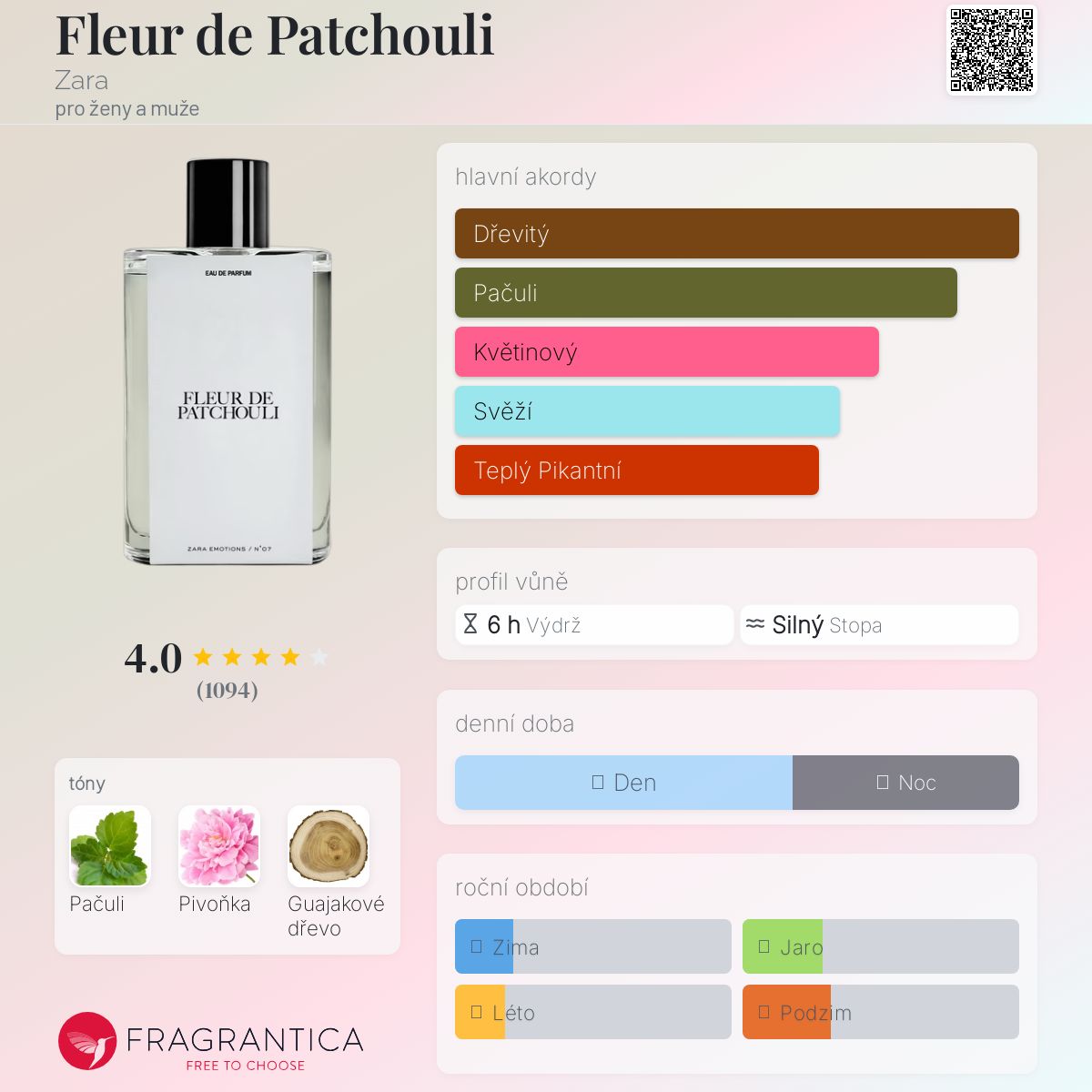 Fleur de Patchouli podle Zara je Woody vůně pro ženy a muže. Fleur de Patchouli byl/a uveden/a v roce 2019. "Nosem" za touto vůní je Jo Malone.