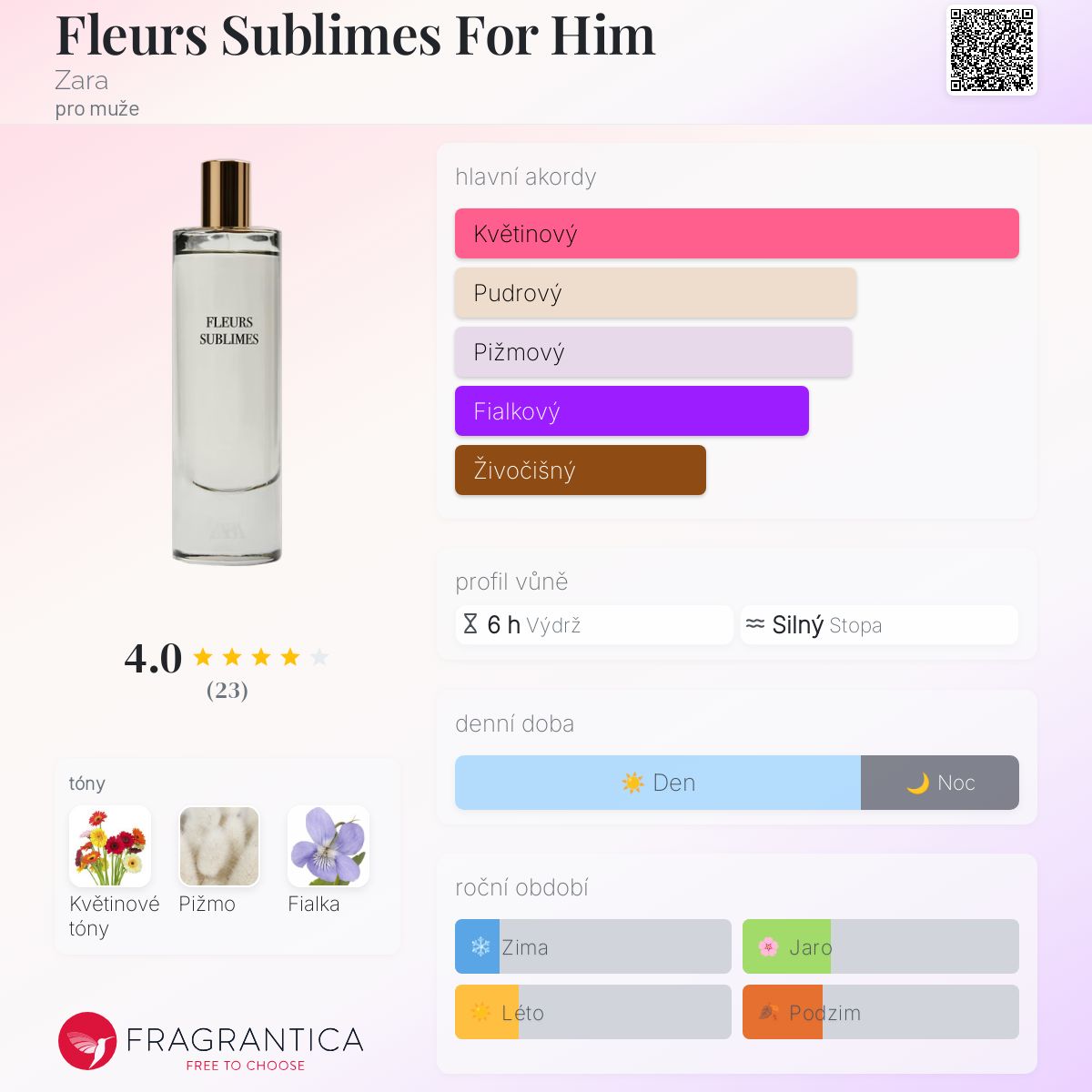 Fleurs Sublimes For Him podle Zara je Floral vůně pro muže. Fleurs Sublimes For Him byl/a uveden/a v roce 2020. Vrchní tón je Fialka ; střední tón jeKvětinové tóny ; základní tón je Pižmo.