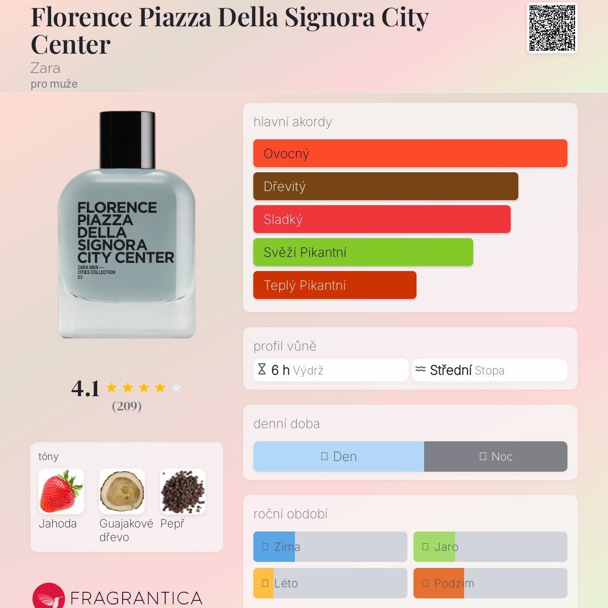 Florence Piazza Della Signora City Center podle Zara je Woody Spicy vůně pro muže. Florence Piazza Della Signora City Center byl/a uveden/a v roce 2021. Vrchní tón je Černý pepř ; střední tón jeJahoda ; základní tón je Guajakové dřevo.