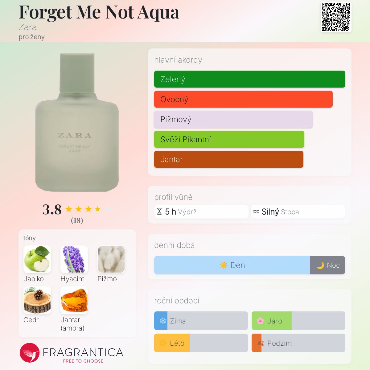 Forget Me Not Aqua podle Zara je Floral Woody Musk vůně pro ženy. Forget Me Not Aqua byl/a uveden/a v roce 2018. Vrchní tón je Zelené jablko ; střední tón jeHyacint ; základní tóny jsou Pižmo, Cedr a Jantar (ambra).