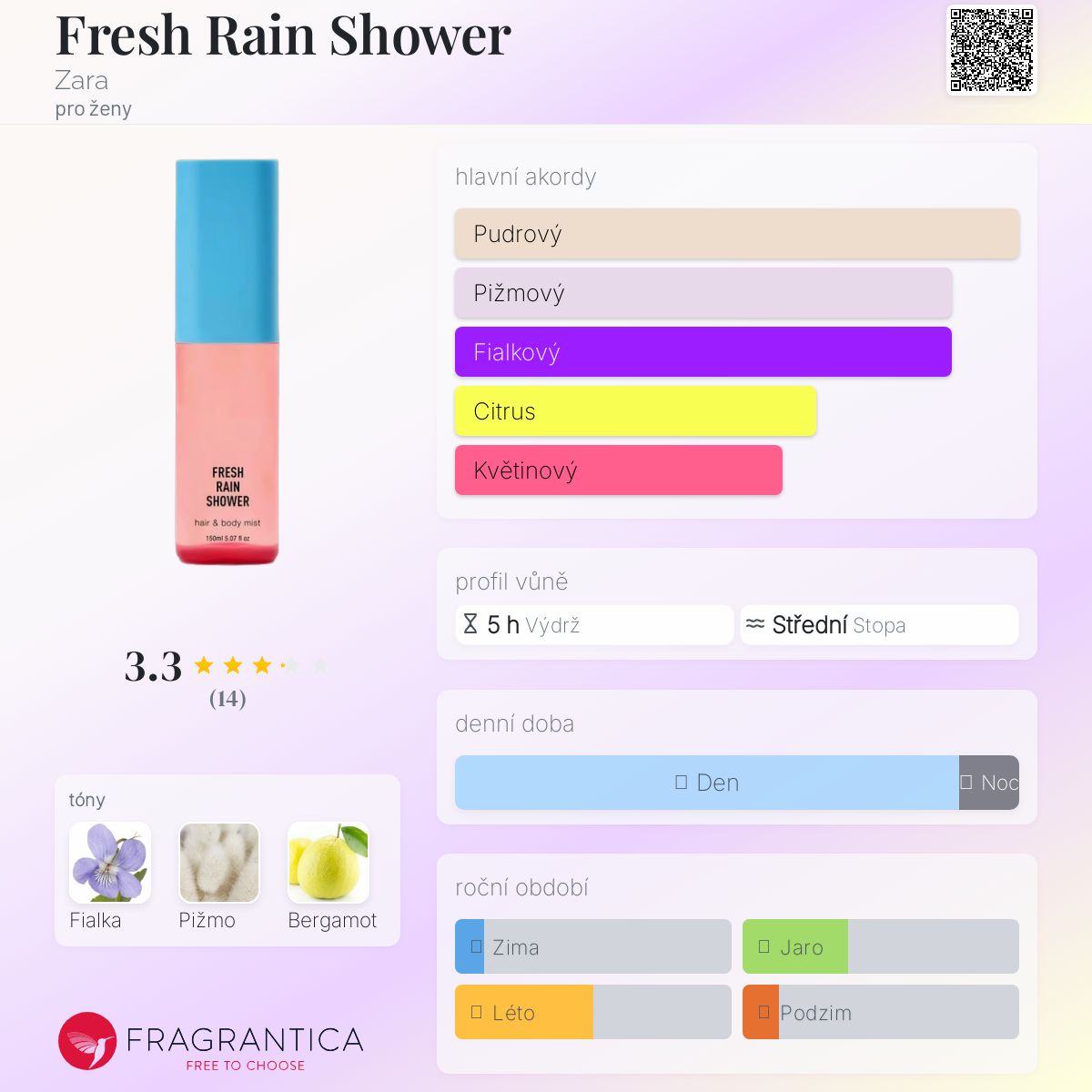 Fresh Rain Shower podle Zara je Floral vůně pro ženy. Toto je nová vůně. Fresh Rain Shower byl/a uveden/a v roce 2025. Vrchní tón je Bergamot ; střední tón jeFialka ; základní tón je Pižmo.