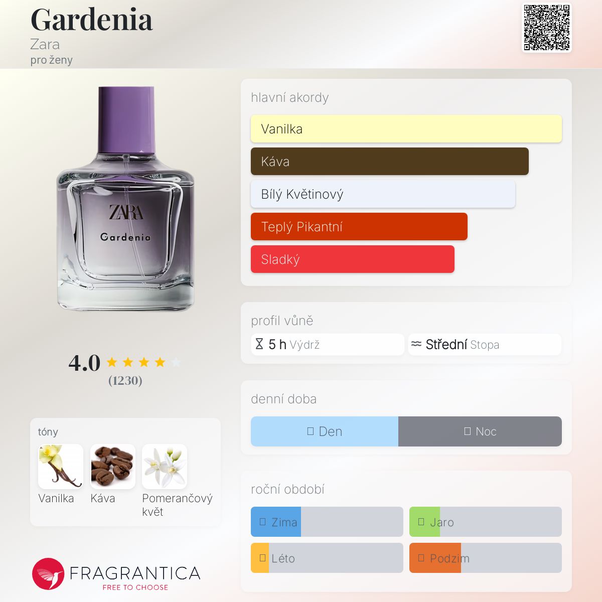 Poznámka: Recenzuji verzi 2022 tohoto parfému, která se objevuje v zaobleném flakonu, i když ve stejné barvě jako flakon na obrázku. Podle webových stránek Zary má tento parfém tóny gardénie, pomerančového květu, kávy, malin a broskve.