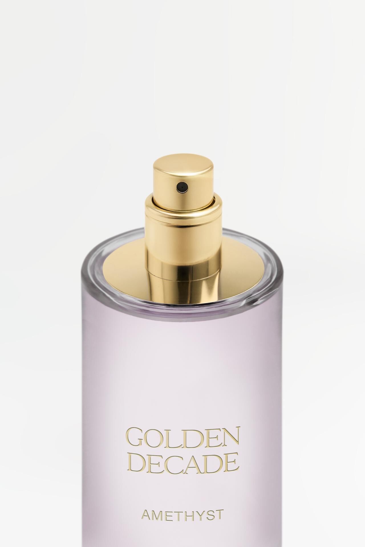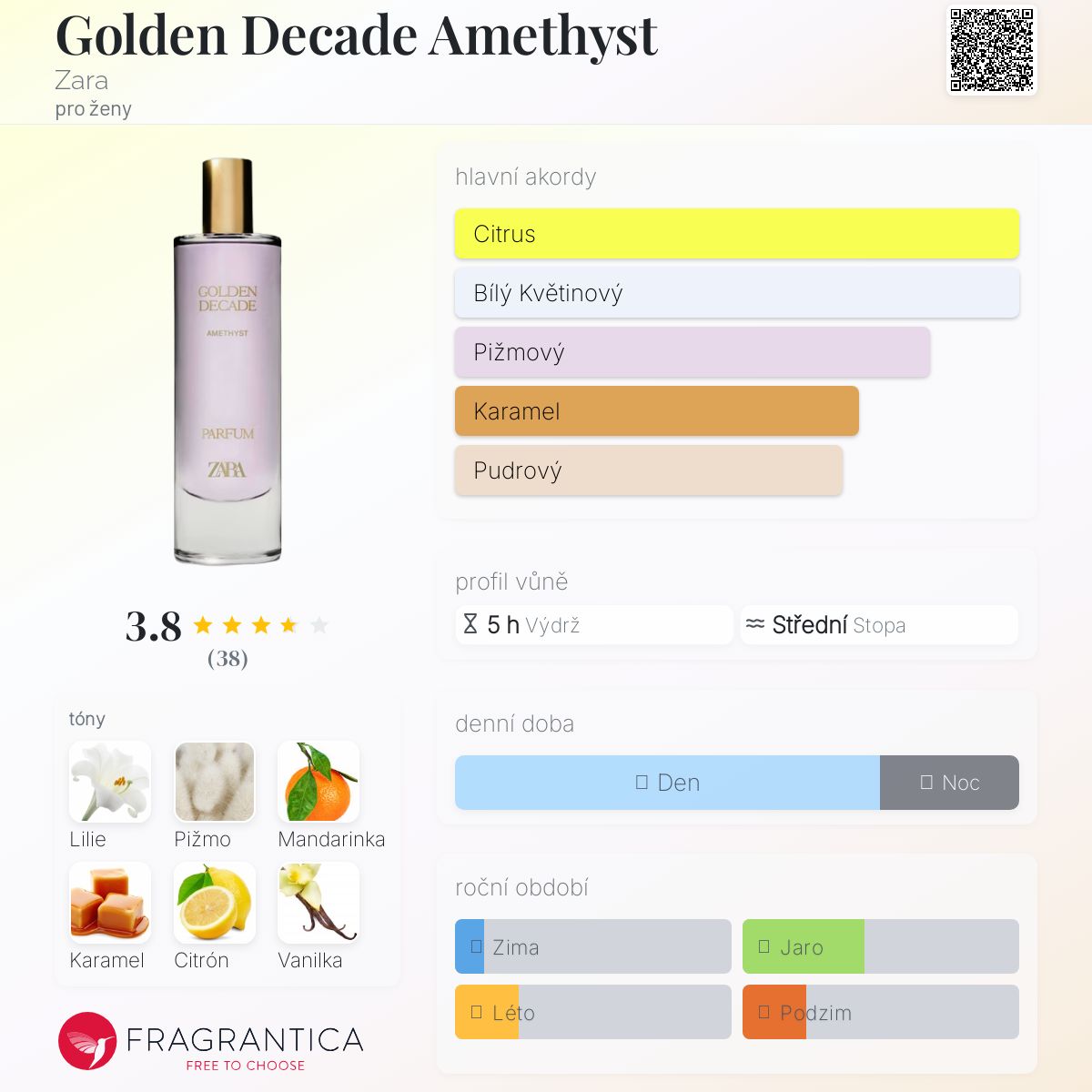 Golden Decade Amethyst podle Zara je Floral Fruity Gourmand vůně pro ženy. Toto je nová vůně. Golden Decade Amethyst byl/a uveden/a v roce 2025. Vrchní tóny jsou Mandarinka, Karamel a Citrón; střední tóny jsouLilie casablanca a Jasmín ; základní tóny jsou Pižmo, Karamel a Vanilka.