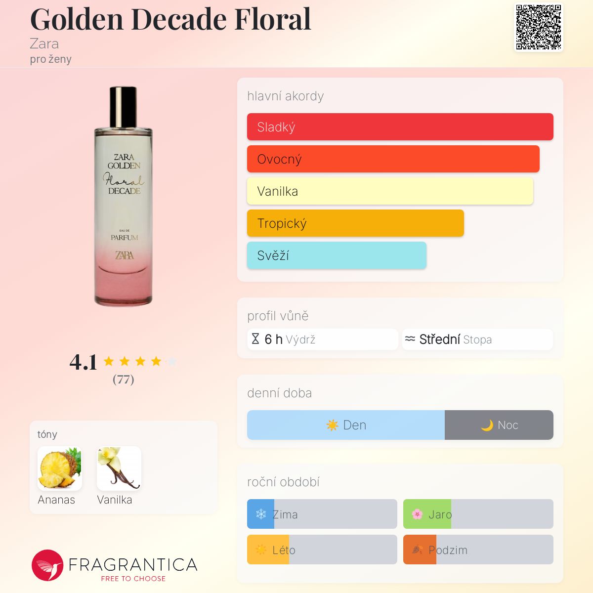 Golden Decade Floral podle Zara je Orientální Vanilla vůně pro ženy. Toto je nová vůně. Golden Decade Floral byl/a uveden/a v roce 2024.