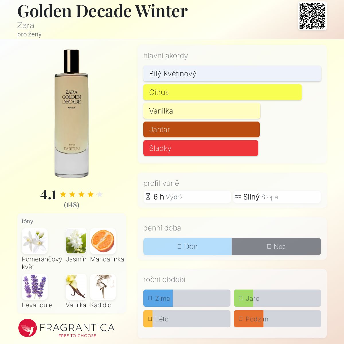 Golden Decade Winter podle Zara je vůně pro ženy. Golden Decade Winter byl/a uveden/a v roce 2023. Vrchní tóny jsou Mandarinka a Bergamot; střední tóny jsouPomerančový květ, Jasmín, Levandule a Kadidlo ; základní tóny jsou Vanilka, Jantar (ambra), Vetiver, Fazole tonka a Pižmo.