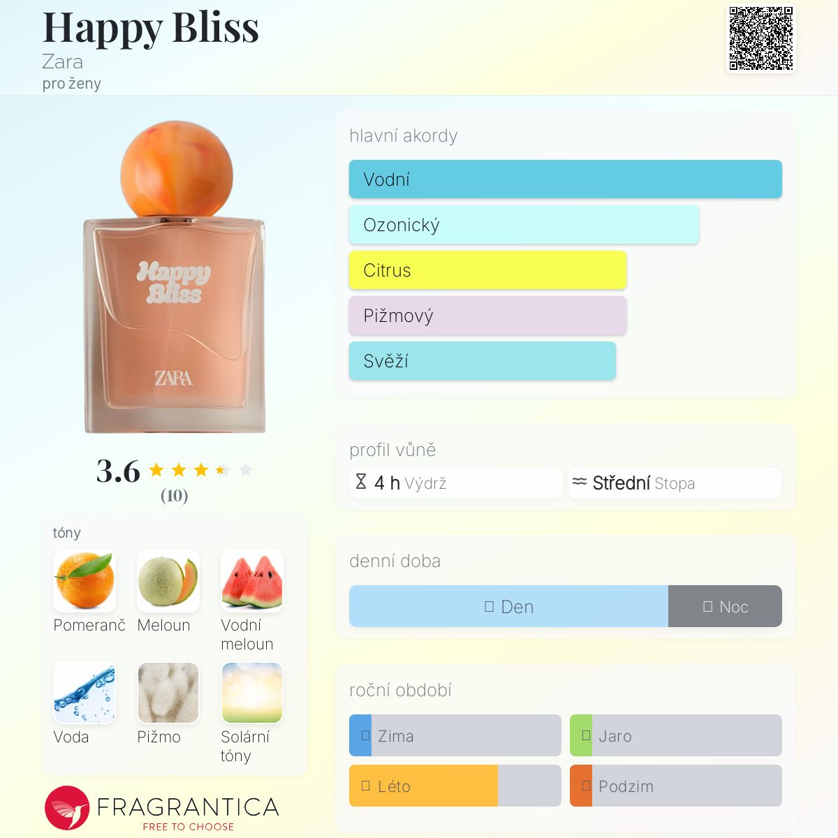 Happy Bliss podle Zara je Aromatic Fruity vůně pro ženy. Happy Bliss byl/a uveden/a v roce 2023. Vrchní tóny jsou Pomeranč, Meloun a Vodní meloun; střední tón jeVodnaté tóny ; základní tóny jsou Pižmo a Solární tóny.