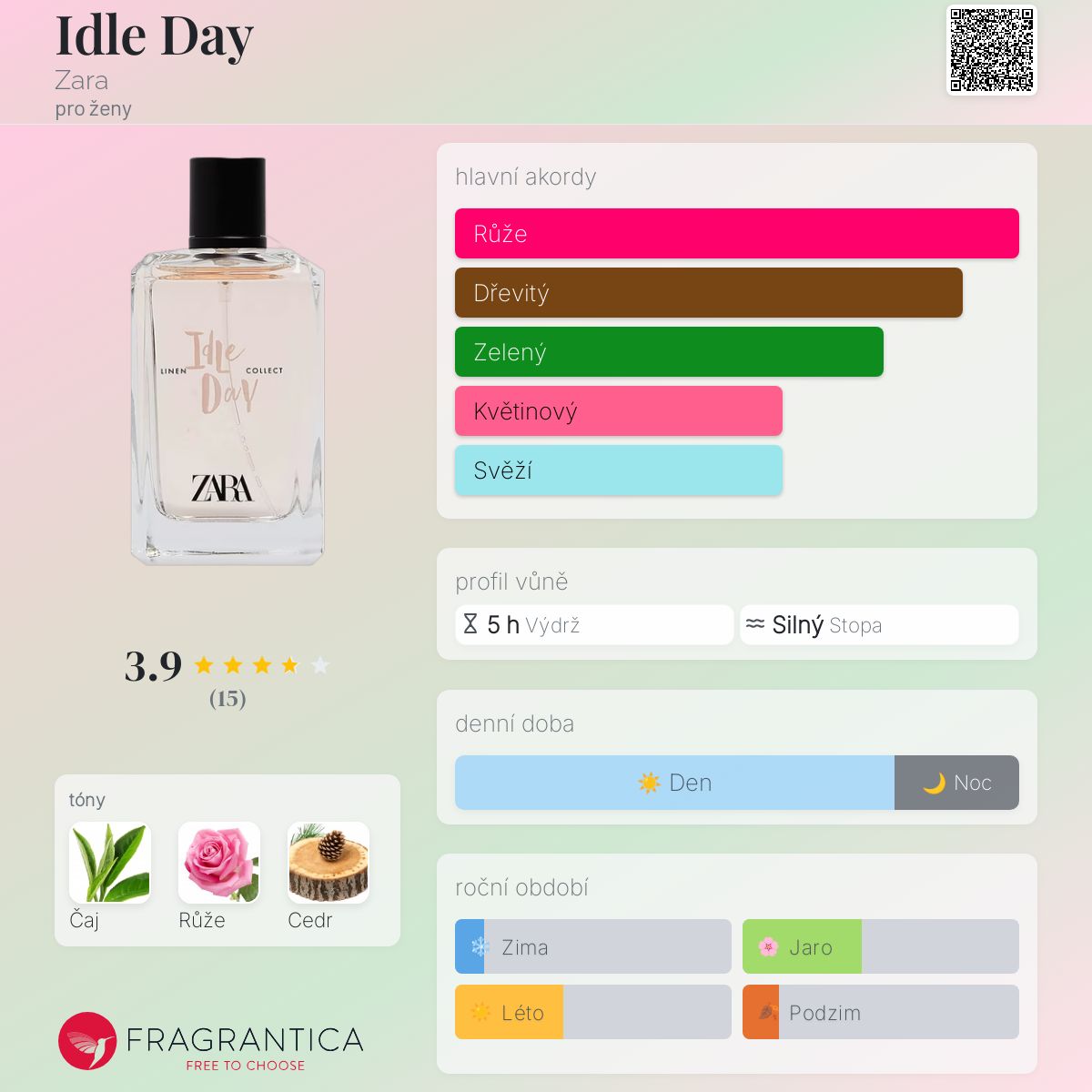 Idle Day podle Zara je Floral Green vůně pro ženy. Idle Day byl/a uveden/a v roce 2019. Vrchní tón je Zelený čaj ; střední tón jeRůže ; základní tón je Cedr.