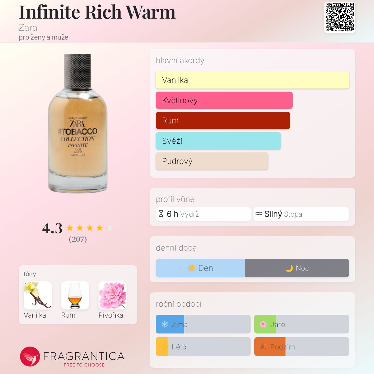 Infinite Rich Warm podle Zara je Orientální Vanilla vůně pro ženy a muže. Toto je nová vůně. Infinite Rich Warm byl/a uveden/a v roce 2024.