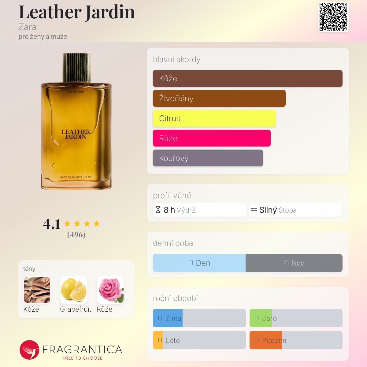Leather Jardin podle Zara je Leather vůně pro ženy a muže. Leather Jardin byl/a uveden/a v roce 2021. "Nosem" za touto vůní je Jo Malone. Vrchní tón je Grapefruit ; střední tón jeRůže ; základní tón je Kůže.
