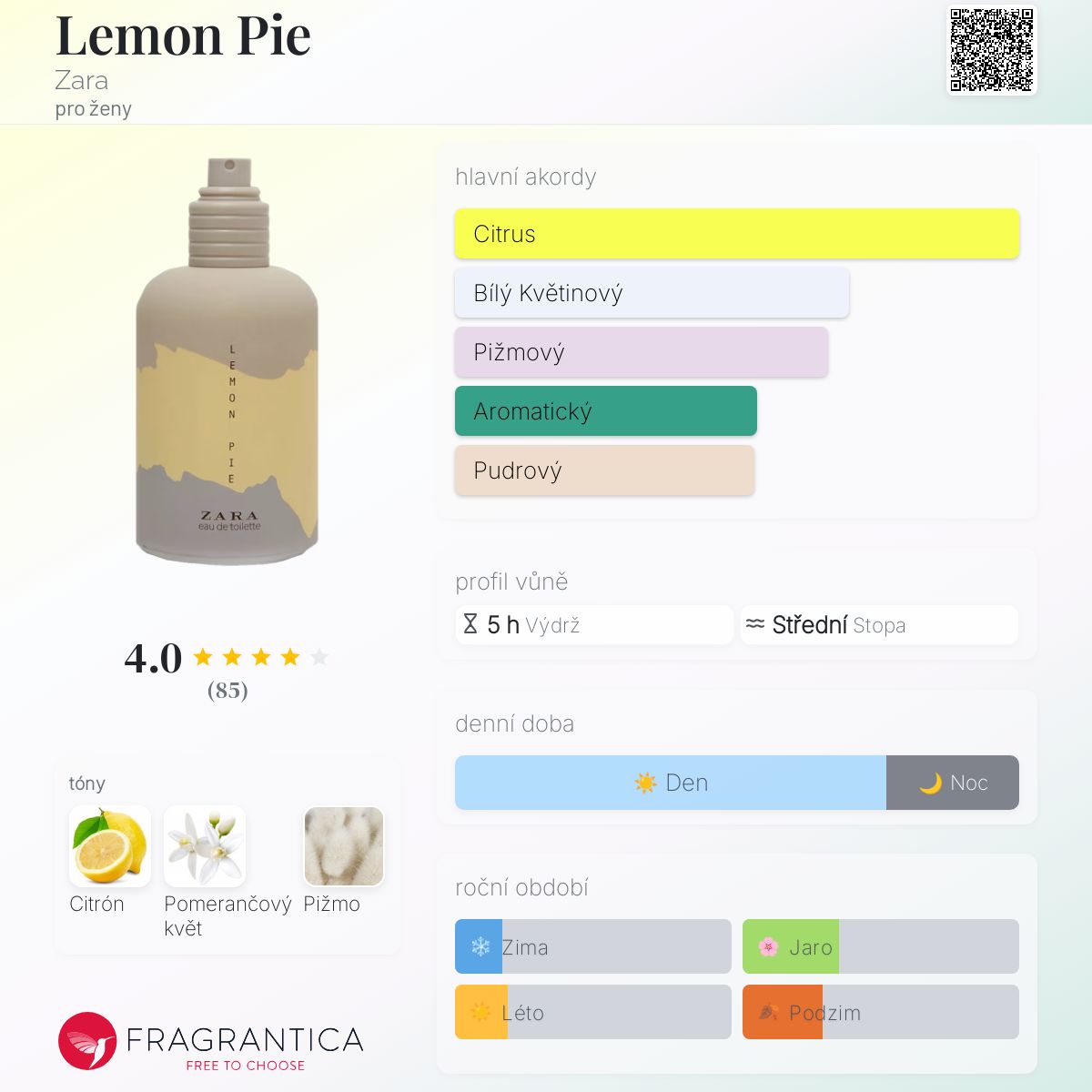Lemon Pie podle Zara je Citrus Gourmand vůně pro ženy. Lemon Pie byl/a uveden/a v roce 2018. Vrchní tón je Citrón ; střední tón jePomerančový květ ; základní tón je Pižmo.