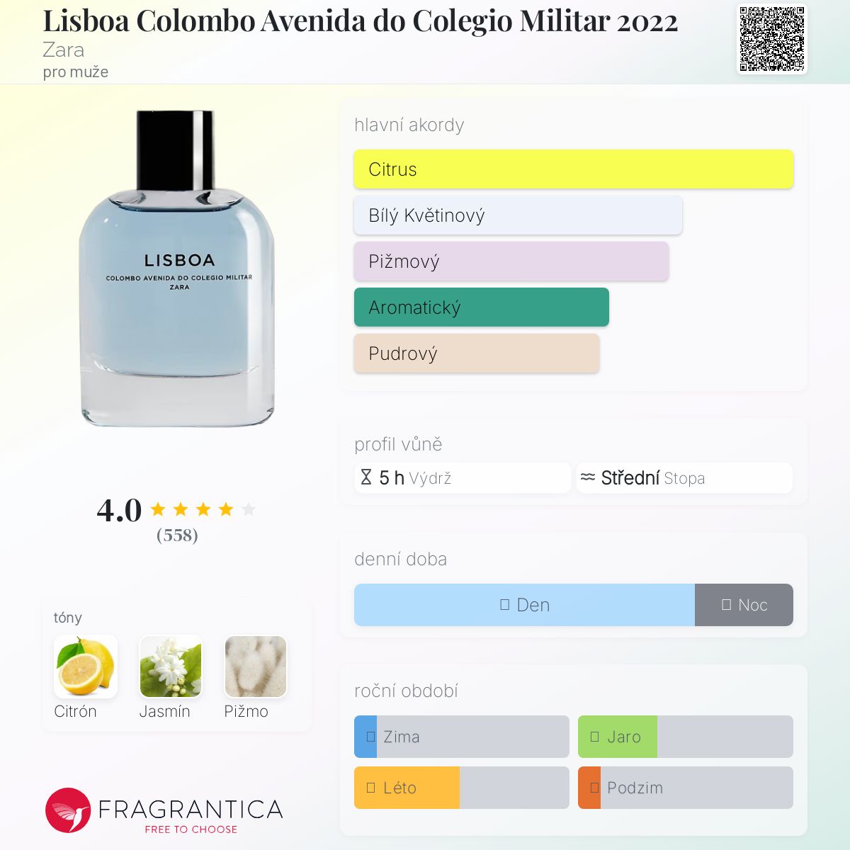 Lisboa Colombo Avenida do Colegio Militar 2022 podle Zara je Citrus Aromatic vůně pro muže. Lisboa Colombo Avenida do Colegio Militar 2022 byl/a uveden/a v roce 2022. Vrchní tón je Citrón ; střední tón jeJasmín ; základní tón je Pižmo.
