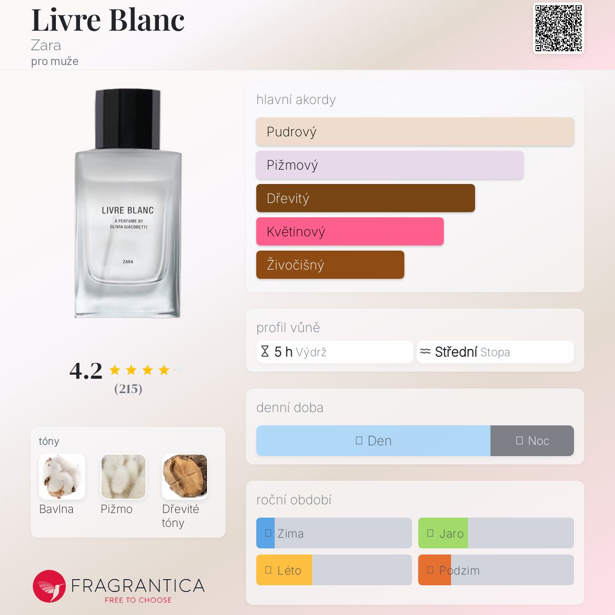 Livre Blanc podle Zara je vůně pro muže. Livre Blanc byl/a uveden/a v roce 2023. "Nosem" za touto vůní je Olivia Giacobetti. Vrchní tón je Bavlna ; střední tón jeBílé dřevo ; základní tón je Pižmo.