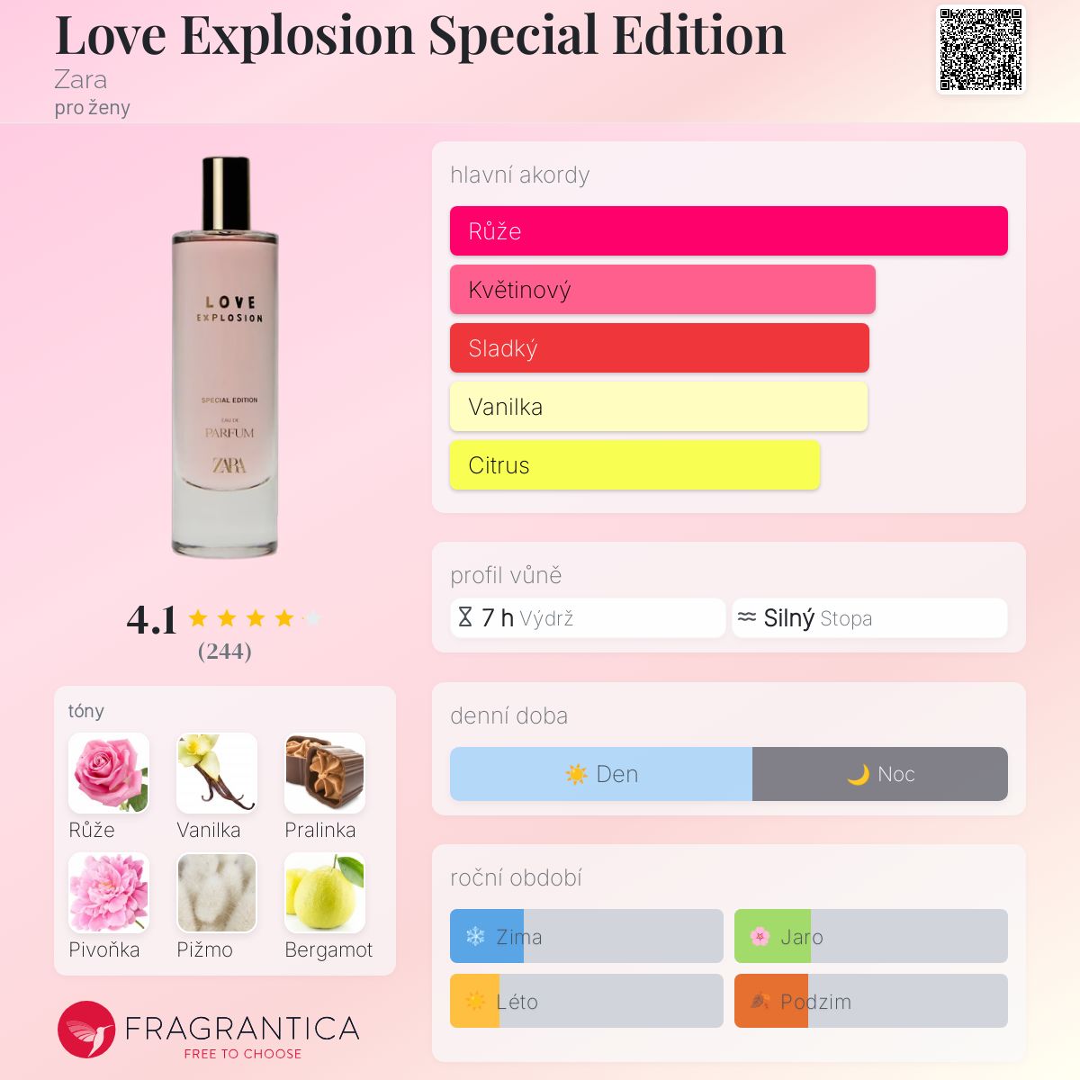 Love Explosion Special Edition podle Zara je vůně pro ženy. Toto je nová vůně. Love Explosion Special Edition byl/a uveden/a v roce 2024. Vrchní tóny jsou Pivoňka, Bergamot a Hořký pomeranč; střední tóny jsouRůže, Pralinka a Jantar (ambra) ; základní tóny jsou Vanilka, Pižmo a Mech.