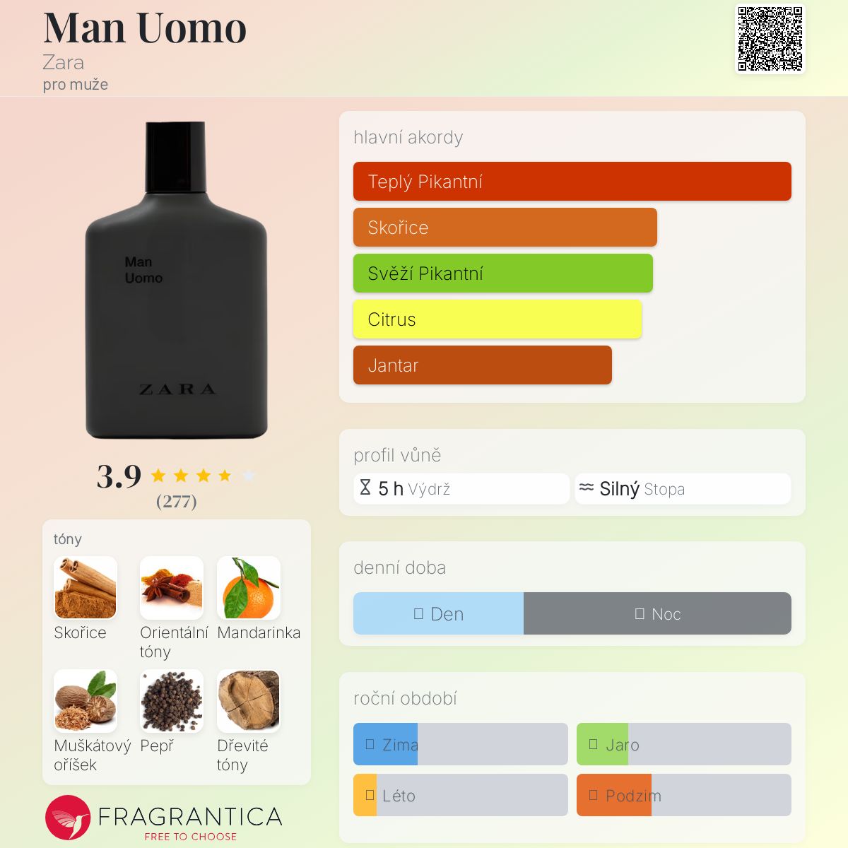 Man Uomo podle Zara je Aromatic Spicy vůně pro muže. Man Uomo byl/a uveden/a v roce 2017. Vrchní tóny jsou Mandarinka, Pepř a Citrón; střední tóny jsouSkořice, Muškátový oříšek a Kardamom ; základní tóny jsou Orientální tóny a Dřevité tóny.