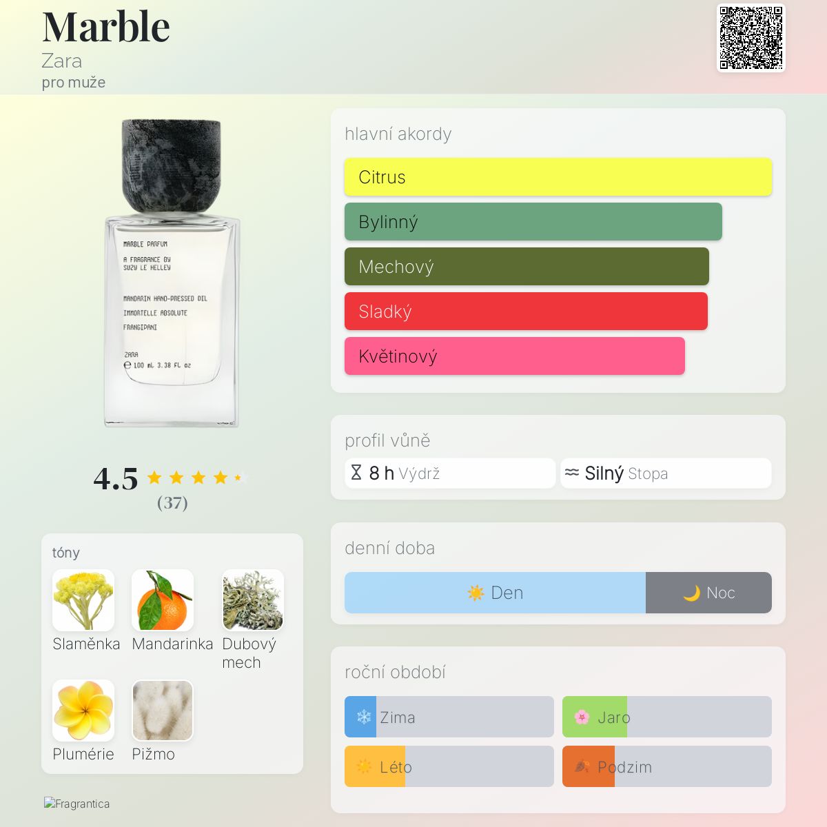 Marble podle Zara je Aromatic vůně pro muže. Toto je nová vůně. Marble byl/a uveden/a v roce 2024. "Nosem" za touto vůní je Suzy Le Helley.