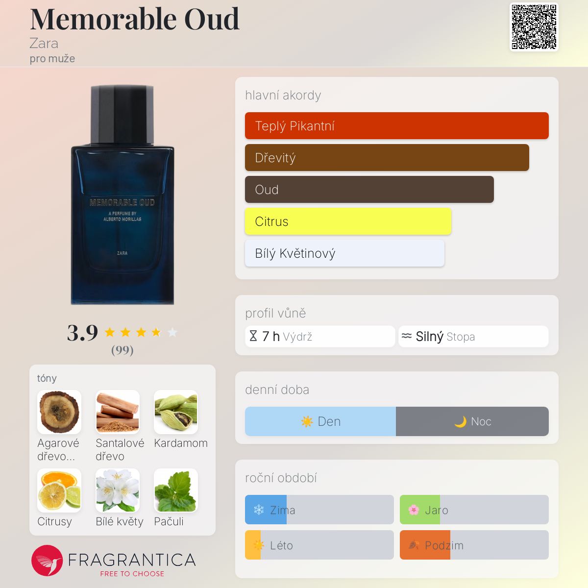 Memorable Oud podle Zara je vůně pro muže. Memorable Oud byl/a uveden/a v roce 2023. "Nosem" za touto vůní je Alberto Morillas. Vrchní tóny jsou Kardamom a Citrusy; střední tón jeBílé květy ; základní tóny jsou Agarové dřevo (oud), Santalové dřevo a Pačuli.